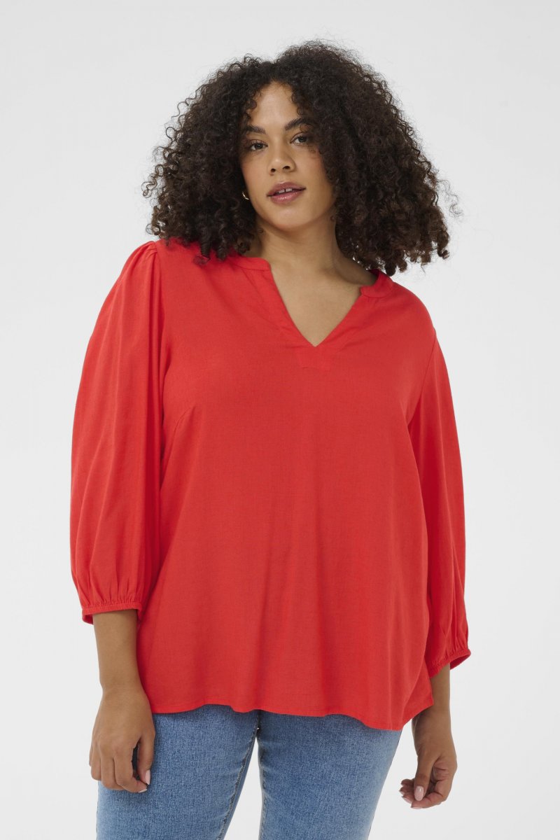 BluzaDostupno u veličinama 42–54Od brenda Kaffe CurveMaterijal: 70 % viskoza (LivaEco™), 30 % lanKlasičan krojCrvena bojaKliknite ovdje za prikazivanje vodiča za veličinu